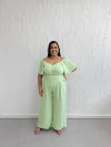 • Modelagem: Macacão longo, pantalona, com decote ombro a ombro estilo manga cigana